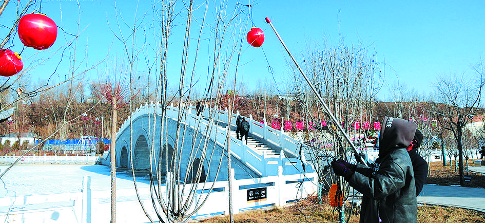 臨夏市在公園和道路主干道等處懸掛各式燈籠、彩色網(wǎng)燈、營造歡樂祥和的喜慶氛圍