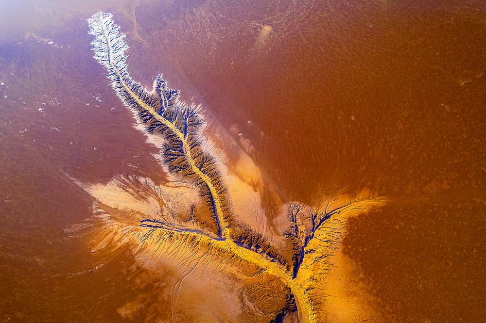 永靖縣劉家峽水庫紅褐色灘涂上裸露的灘涂與“潮汐樹”相映成趣